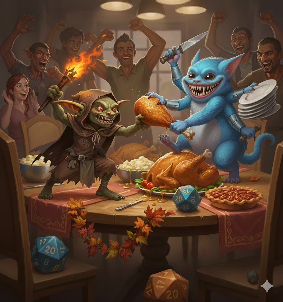 The turkey is afoot, the pies are secured, and the kitchen has become a high-level encounter zone. Drop your character sheets, but keep your dice bag handyβ€”it’s time to use every tactical advantage you’ve earned!